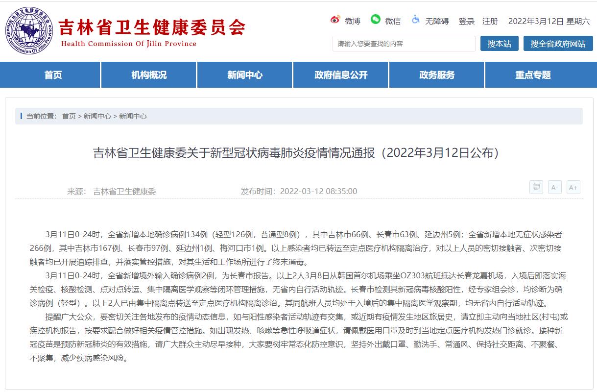 吉林省衞生健康委3月12日通報稱,3月11日0-24時,吉林省新增本地確診病例134例(輕型126例,普通型8例),其中吉林市66例、長春市63例、延邊州5例;新增本地無症狀感染者266例,其中吉林市167例、長春市97例、延邊州1例、梅河口市1例。以上感染者均已轉運至定點醫療機構隔離治療,對以上人員的密切接觸者、次密切接觸者均已開展追蹤排查,並落實管控措施,對其生活和工作場所進行了終末消毒。