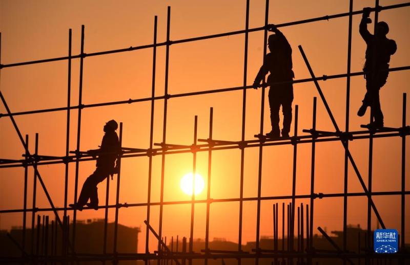 2022年1月1日,在河北雄安新區容西安置房項目D標段施工現場,中鐵上海工程局工人在新年第一縷陽光的照耀下工作。新華社發(傅新春 攝)