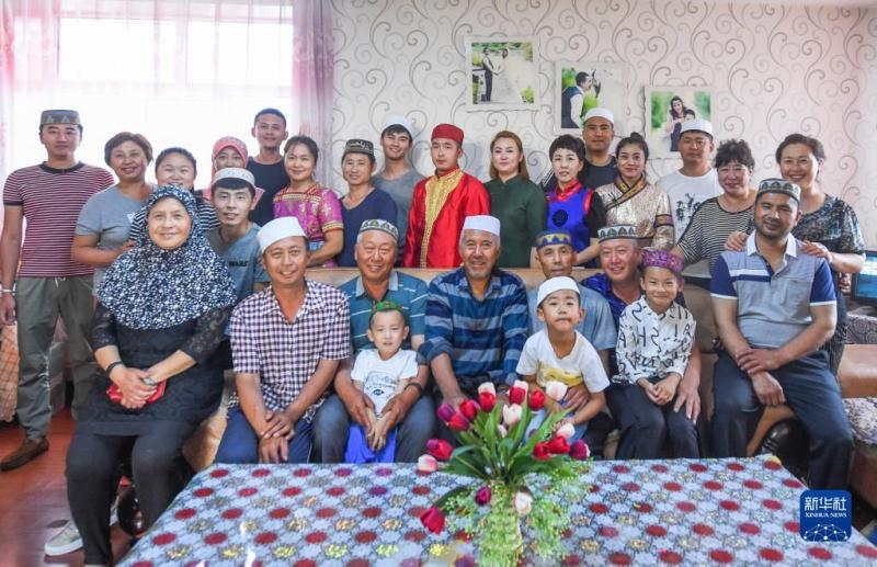 這是家住內蒙古呼倫貝爾的夏民山(前排右三)家的家庭合影。他家由回族、漢族、蒙古族、達斡爾族、鄂温克族、滿族共6個民族組成,45口人,三代同堂(2017年7月16日攝)。新華社記者 連振 攝