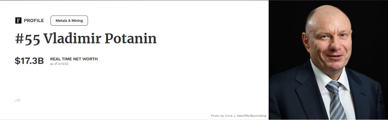 據彭博社,波塔寧是俄羅斯首富。儘管今年諾里爾斯克鎳業股價暴跌,令他損失了約四分之一的財富,但他仍擁有約225億美元的資產。而根據福布斯3月13日最新估計,波塔寧資產淨值為173億美元,位居俄羅斯第二。