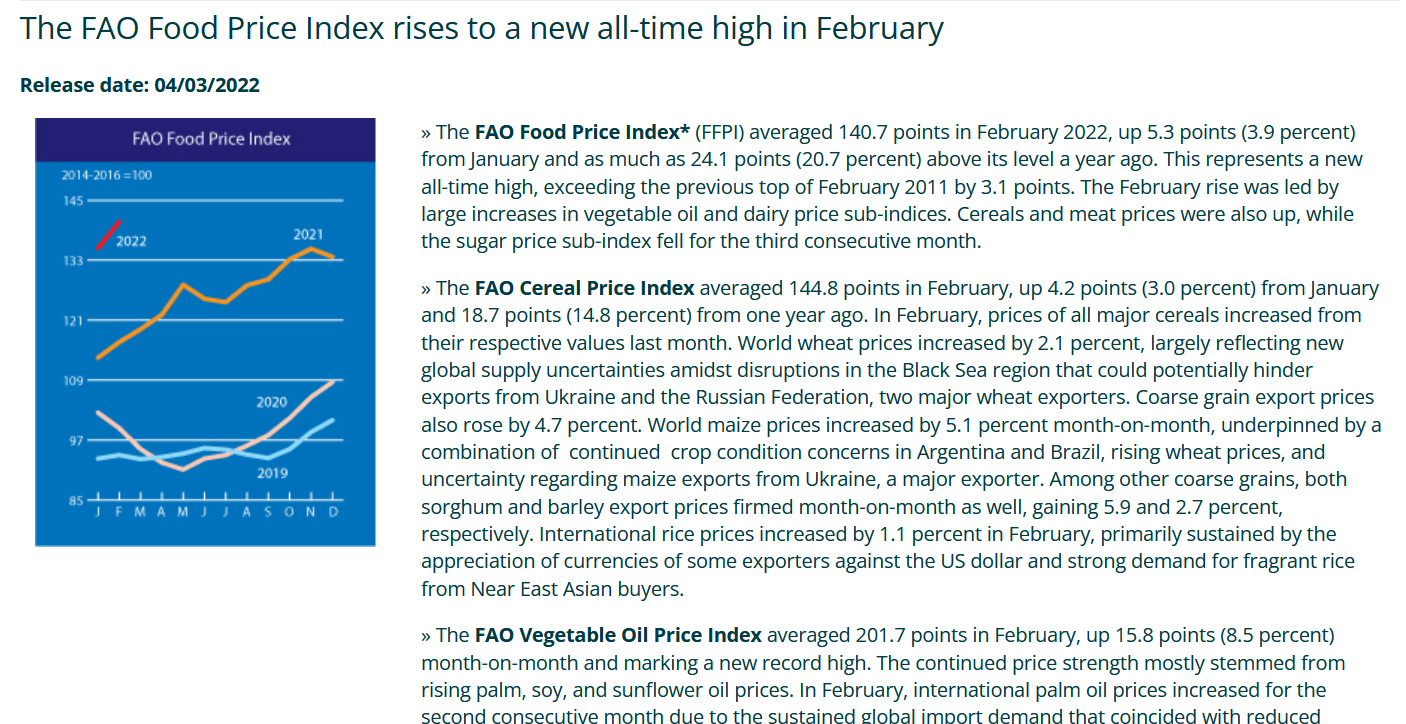 3月11日聯合國糧食及農業組織(FAO)發佈警告稱,俄烏衝突影響糧食貿易和預期收成。全球糧食價格可能在目前創記錄的高位水平上再度上漲約8-20%。早在本月4日,聯合國糧農組織食品價格指數(FAO Food Price Index)2月水平已創歷史新高。其中植物油價格指數環比上漲8.5%,創歷史新高;此外穀物價格指數環比增長3.0%,同比上升14.8%。