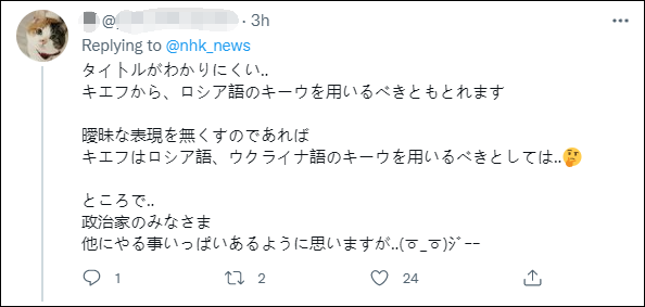 報道稱,在俄羅斯繼續對烏克蘭進行軍事進攻的情況下,有出席者稱,目前基輔“キエフ”這一片假名標記方式是“基於侵略方的俄語”而來,這是“不合適的”,建議日本政府應該使用“符合烏克蘭語的‘キーウ’(‘基烏’)”。