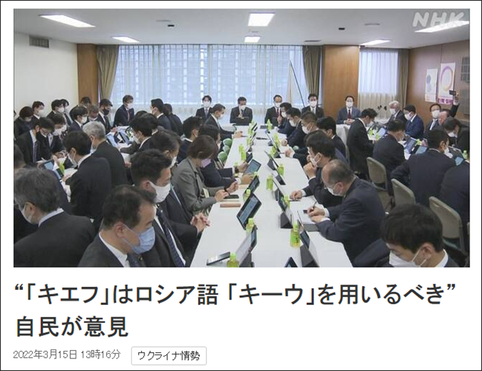 在今日(15日)的自民黨會議上,有參會者認為片假名“キエフ(基輔)”是基於俄語而來,這“不合適”,建議應該換成符合烏克蘭語的“キーウ”(讀音類似“基烏”)……