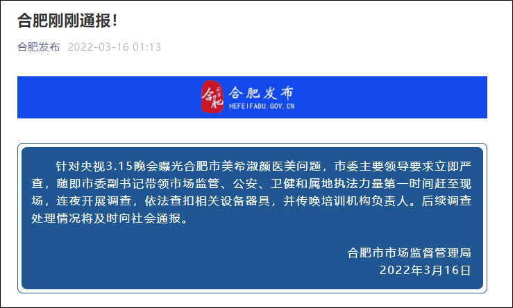315晚會曝光美希淑顏醫美問題,合肥市委副書記帶隊連夜檢查
