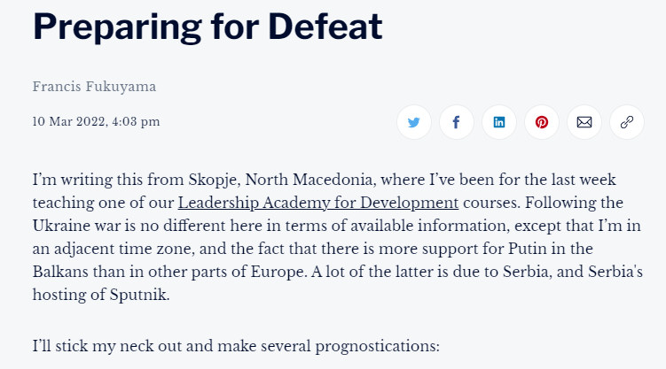 3月10日,福山在《美國目的》(American Purpose)雜誌發表專欄文章《準備失敗》,是對“普京主義”的歷史審判,判定普京與俄羅斯必敗,因為自由民主必勝。