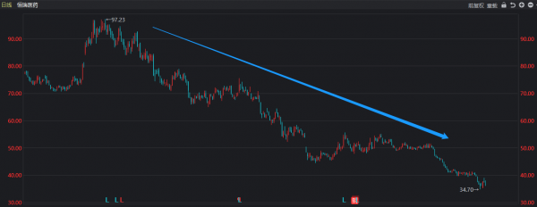 從去年1月股價創新高之後,恆瑞醫藥股價就進入了下行通道。截至3月15日收盤,該公司股價自97.23元/股已跌去64.28%,成為其上市以來最大的股價回調記錄。