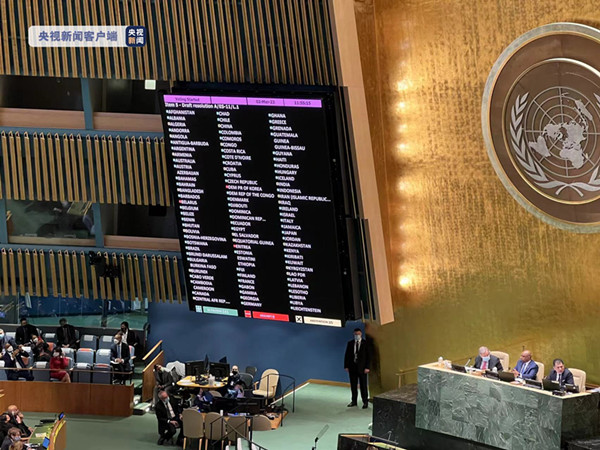 聯大緊急特別會議上,各國就烏克蘭局勢決議草案進行投票表決 圖片來源:央視新聞