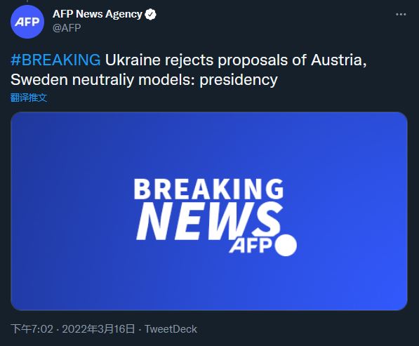 但隨後烏克蘭總統辦公室主任顧問波多里亞克就否認了上述消息。他表示烏克蘭不能接受瑞典或奧地利中立模式,中立只能是“烏克蘭式”的。