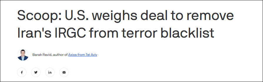 三名以色列官員和兩名美國消息人士告訴AXIOS網站,拜登政府正在考慮是否將革命衞隊移除恐怖分子名單,以換取伊朗在區域或其他伊斯蘭革命衞隊活動方面做出某種承諾,或採取某些措施。美國方面還沒有讓伊朗方面做出何種承諾或是進行何種措施。