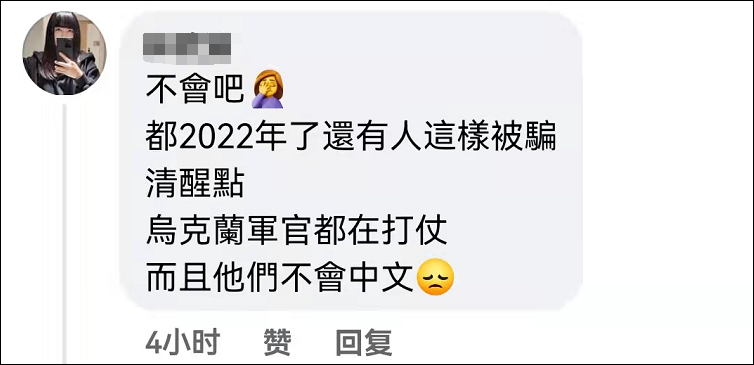 還有人表示,真正的烏克蘭軍官應該在忙着打仗,恐怕沒有時間談戀愛。“人家在打仗都來不及,還跟你談戀愛……”“都2022年了還有人這樣被騙,清醒點,烏克蘭軍官都在打仗,而且他們不會中文。”