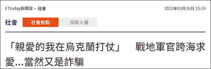 16日,多家台媒報道了這一“與時俱進”的詐騙案,令許多島內網民大感無語:“都2022年了還有人這樣被騙,清醒點,烏克蘭軍官都在打仗,而且他們不會中文。”“人家在打仗都來不及,還跟你談戀愛……”
