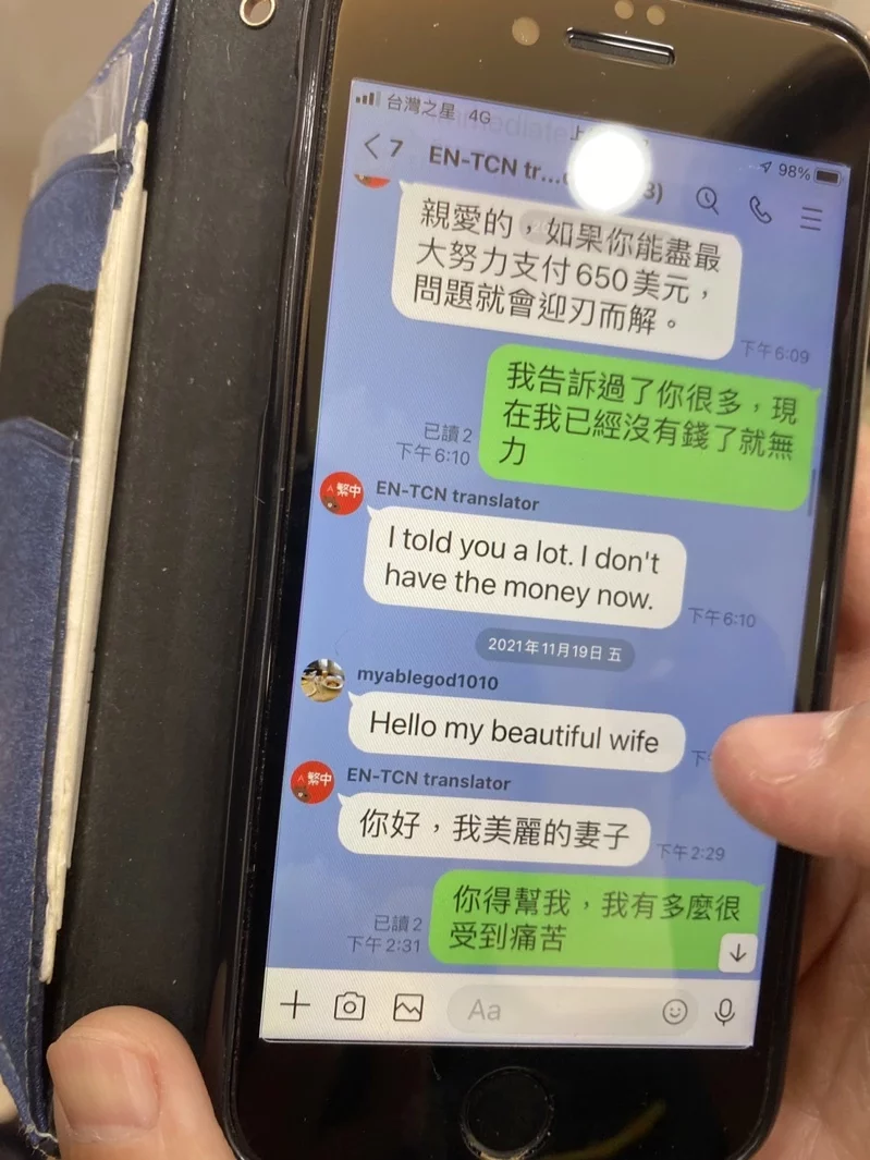 據報道,這名“烏克蘭軍官”向莊某佯稱,等烏克蘭與俄羅斯的戰爭結束後,要來台灣與她“長相廝守”。但目前他因戰爭缺錢用,希望莊某先去住宅附近的銀行匯款10萬新台幣(約合人民幣2.23萬元)資助他。