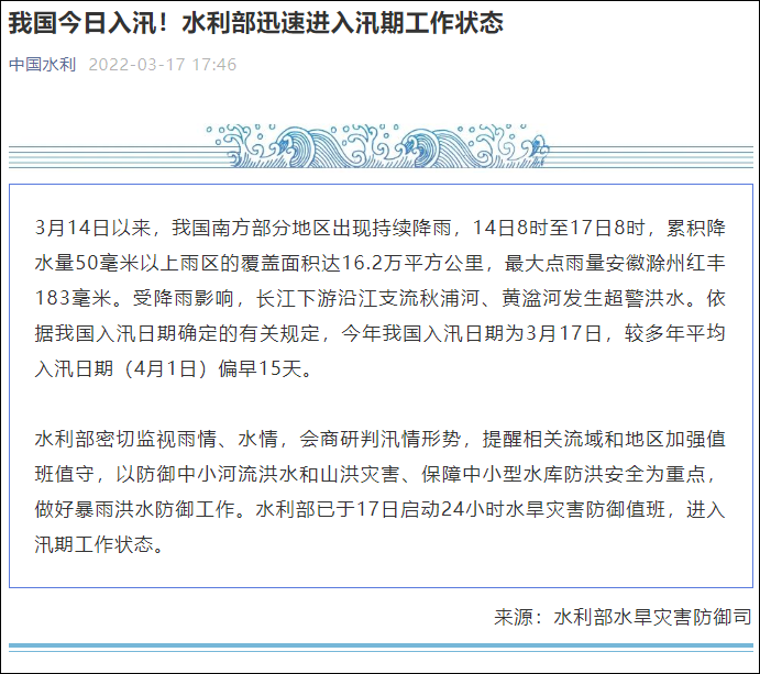 水利部:今日我國已入汛,較多年平均入汛日期偏早15天