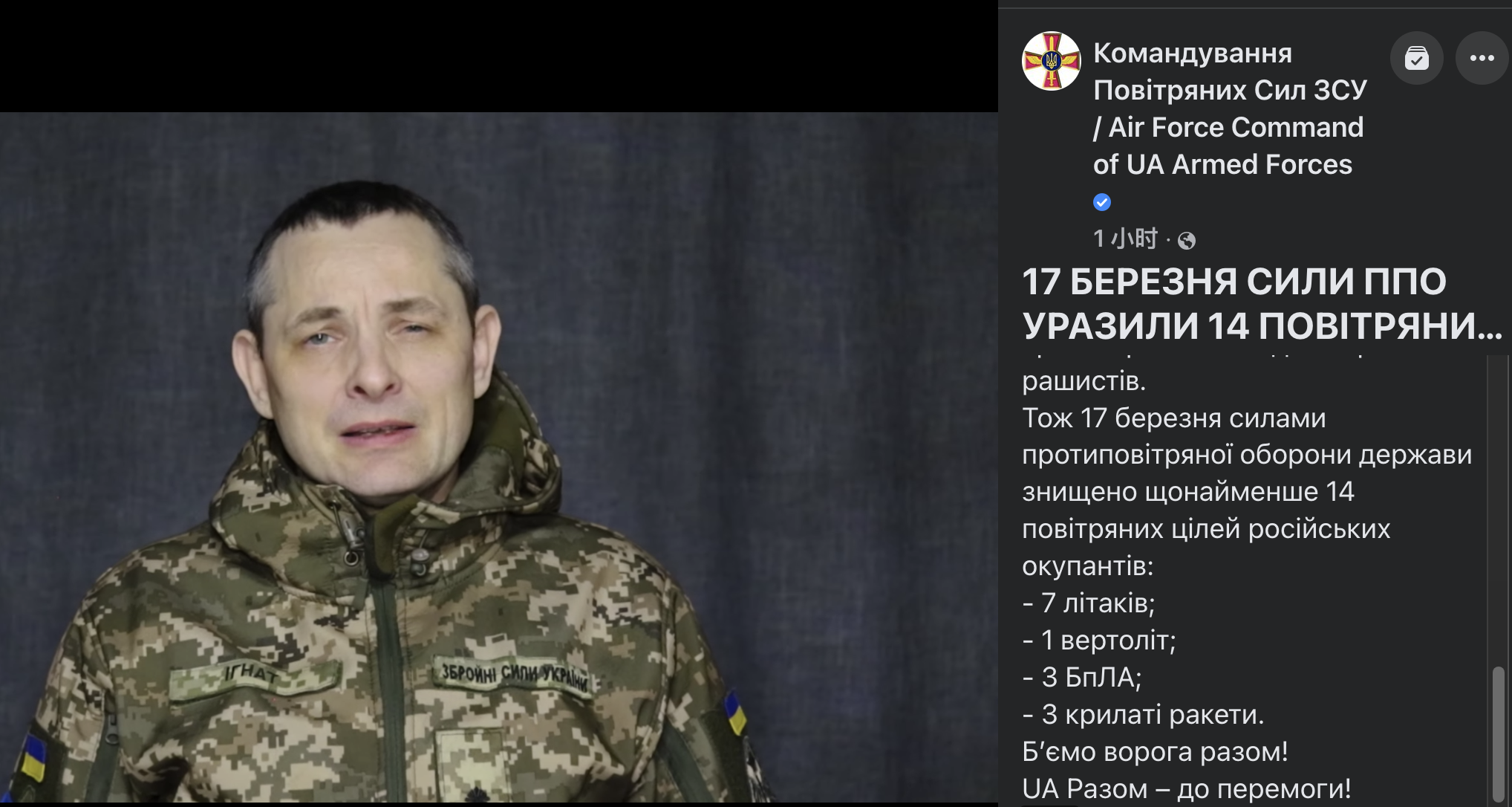 烏克蘭空軍司令部3月17日在臉書的戰報截圖