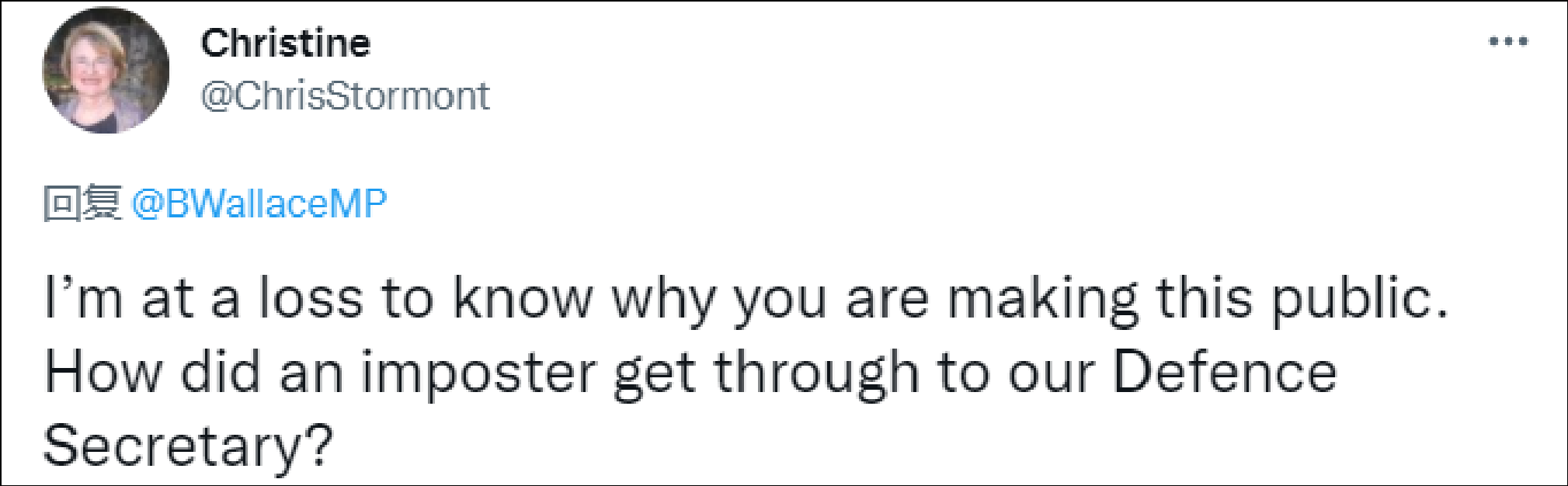 “我只是不明白為什麼國防大臣會發這樣的推文……如果這事真的發生了,你使用的是安全線路嗎?(如果是的話,冒名頂替者是怎麼接入進來的——我猜軍情六處已經發現了?)如果不是,為什麼不用呢?你覺得有必要公開強調這件事本身就很奇怪。”