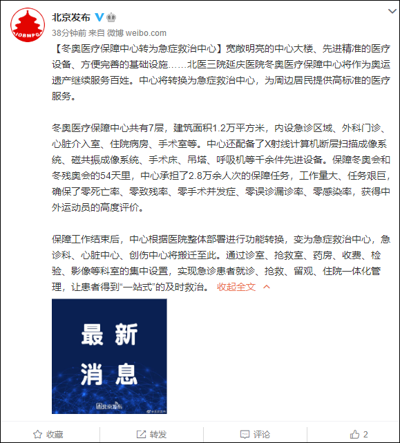 @北京發佈 3月18日消息,寬敞明亮的中心大樓、先進精準的醫療設備、方便完善的基礎設施……北醫三院延慶醫院冬奧醫療保障中心將作為奧運遺產繼續服務百姓。中心將轉換為急症救治中心,為周邊居民提供高標準的醫療服務。