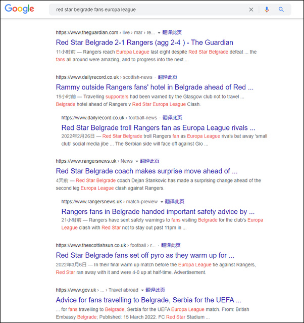 以“塞爾維亞球迷”、“貝爾格萊德紅星球迷”、“歐羅巴聯賽”的英文詞條在谷歌上搜索,相關新聞屈指可數,主流媒體更是無人問津,有的只是簡單的戰報。