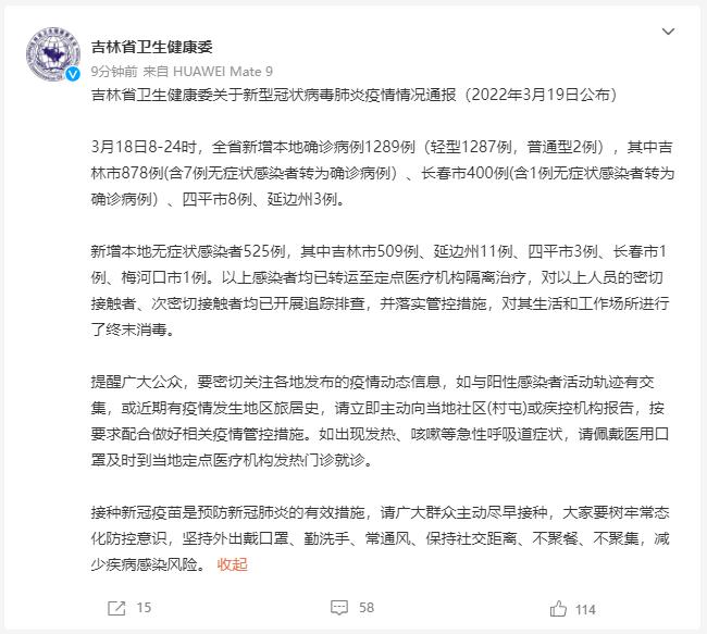 據@吉林省衞生健康委 通報,3月18日8-24時,吉林省新增本地確診病例1289例(輕型1287例,普通型2例),其中吉林市878例(含7例無症狀感染者轉為確診病例)、長春市400例(含1例無症狀感染者轉為確診病例)、四平市8例、延邊州3例。