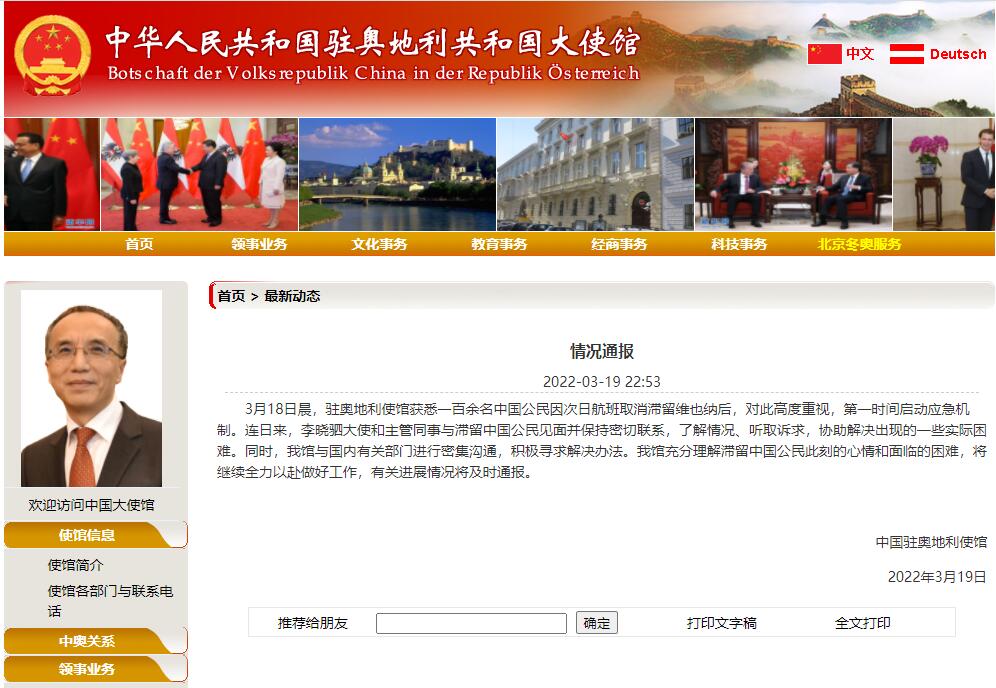 3月19日,中國駐奧地利大使館發佈情況通報稱,18日晨,駐奧地利使館獲悉一百餘名中國公民因次日航班取消滯留維也納後,對此高度重視,第一時間啓動應急機制。連日來,李曉駟大使和主管同事與滯留中國公民見面並保持密切聯繫,瞭解情況、聽取訴求,協助解決出現的一些實際困難。同時,我館與國內有關部門進行密集溝通,積極尋求解決辦法。