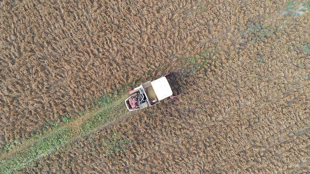 △2021年11月3日,在位於山東省東營市的黃河三角洲農業高新技術產業示範區,工人正操控機械開鐮收割東航D11號航天大豆。