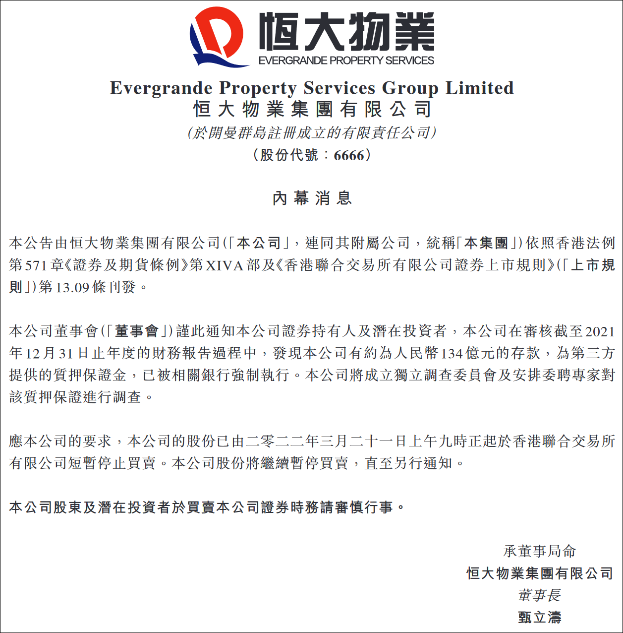 其中,最為引人注目的是,據恒大物業披露,其在審核截至2021年12月31日止年度的財務報告過程中,發現恒大物業有約為134億元存款,為第三方提供的質押保證金,已被相關銀行強制執行。恒大物業將成立獨立調查委員會及安排委聘專家對該質押保證進行調查。