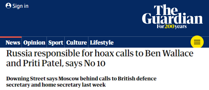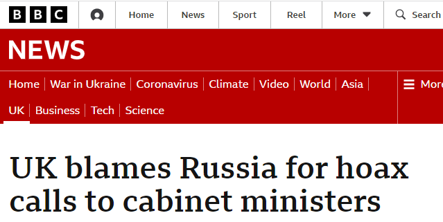 英國首相發言人聲稱:“俄羅斯政府對上週打給英國大臣的惡作劇電話負有責任。”