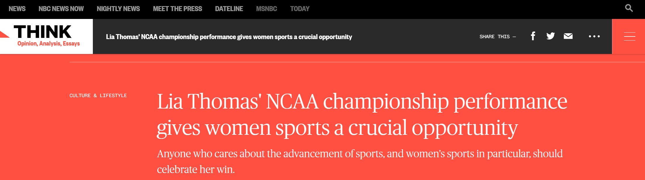 在此之際,美國全國廣播公司(NBC)22日在推特上轉發了一篇支持托馬斯的評論文章,並引用作者的話作為轉發語:“任何關心體育進步,特別是女子運動的人,都應該慶祝利亞·托馬斯的勝利”。
