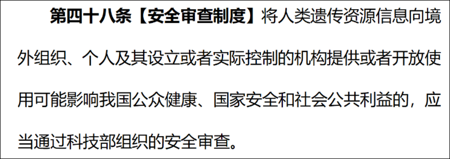 第四十八條要求,將人類遺傳資源信息向境外組織、個人及其設立或者實際控制的機構提供或者開放使用可能影響我國公眾健康、國家安全和社會公共利益的,應當通過科技部組織的安全審查。