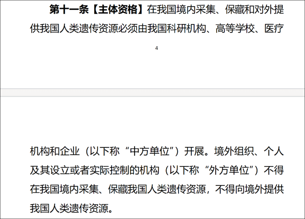 《徵求意見稿》中,第十一條規定,在我國境內採集、保藏和對外提供我國人類遺傳資源必須由我國科研機構、高等學校、醫療機構和企業(以下稱“中方單位”)開展。境外組織、個人及其設立或者實際控制的機構(以下稱“外方單位”)不得在我國境內採集、保藏我國人類遺傳資源,不得向境外提供我國人類遺傳資源。