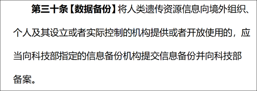 第三十條規定,將人類遺傳資源信息向境外組織、個人及其設立或者實際控制的機構提供或者開放使用的,應當向科技部指定的信息備份機構提交信息備份並向科技部備案。