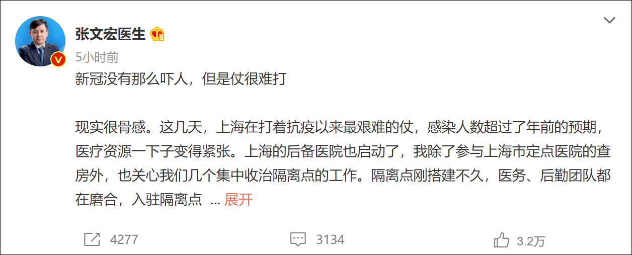 新冠沒有那麼嚇人,但是仗很難打 來源:@張文宏醫生