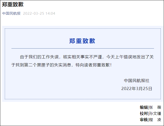 中國民航報社鄭重致歉:上午錯誤發出找到第二個黑匣子的失實消息 None 2022-03-25 鄭重致歉 由於我們的工作失誤,核實相關事實不嚴謹,今天上午錯誤地發出了關於找到第二個黑匣子的失實消息,特向讀者鄭重致歉! 中國民航報社 2022年3月25日