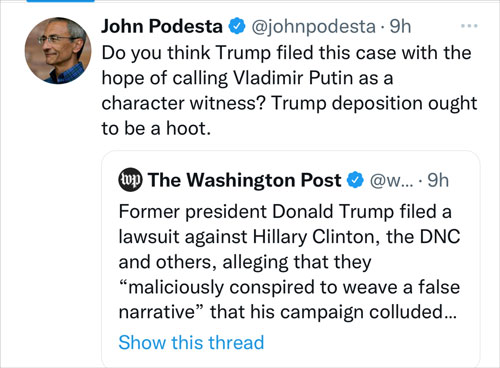 對於特朗普的起訴,2016年希拉里競選團隊主席、訴訟被告之一約翰·波德斯塔(John Podesta)在推特上表示,訴訟的部分內容可能是“有趣的”。