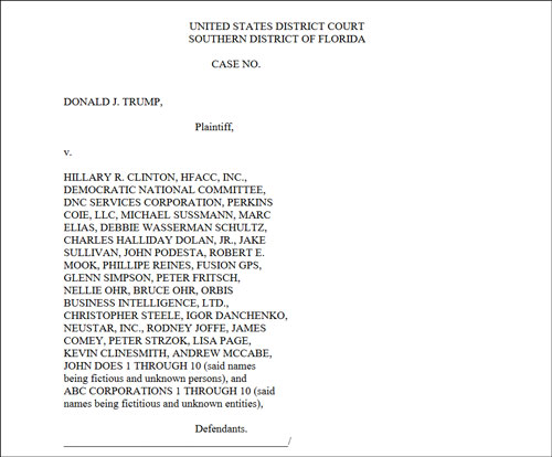特朗普在一封長達108頁的訴狀書中寫道“被告一致行動,惡毒地密謀編造虛假的敍述,稱他們的共和黨對手與一個懷有敵意的外國主權國家勾結”,特朗普還明確提到了希拉里等人“構陷”他的方式,以及民主黨和政府官員犯下的一系列罪行,從敲詐勒索到惡意起訴,從計算機欺詐到竊取機密網絡數據,他聲稱“在‘反對派研究’、‘數據分析’和其他政治策略的幌子下,被告邪惡地試圖動搖公眾的信任,”並且表示,“他們合作只有一個自私的目的:詆譭唐納德·j·特朗普。”