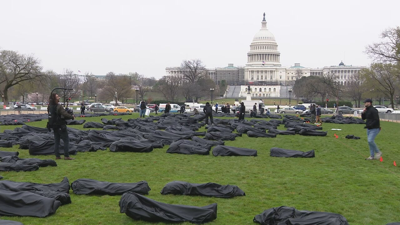組織者稱,每一個屍體袋象徵着150名因槍支而死的人,圖為美媒報道截圖