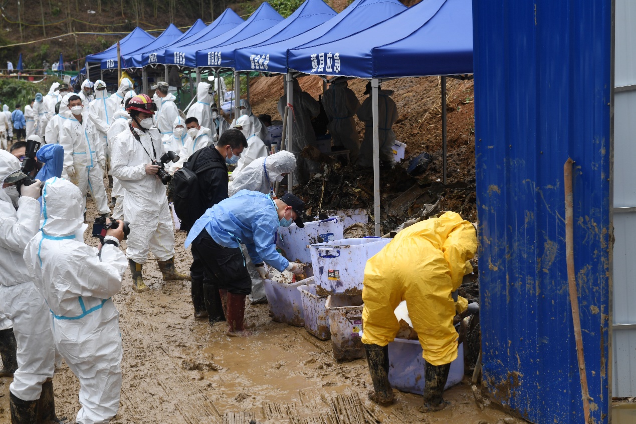 目前事故現場還在進行遇難者遺體、遺物以及飛機殘骸的收集工作。從現場發來的視頻與照片中可以看到,大型設備已經進入事故現場進行挖掘工作,其他搜索人員也在事故現場核心區域及周邊開展地毯式搜索。