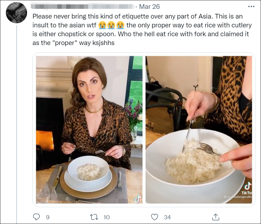 “請不要把這種禮儀帶到亞洲的任何地方。這是對亞洲人的侮辱,用餐具吃米飯的唯一正確方法是用筷子或勺子。誰會用叉子吃米飯,還聲稱這是‘正確’的方式。”