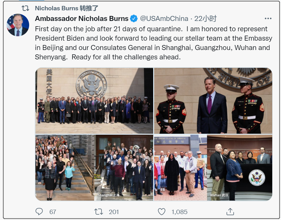 與此同時,伯恩斯在當日發帖稱:“隔離21天后上任第一天。我很榮幸代表拜登總統,並期待與我們在北京的大使館以及我們在上海、廣州、武漢和瀋陽的總領事館的出色團隊一起工作。準備好了迎接未來的所有挑戰。”