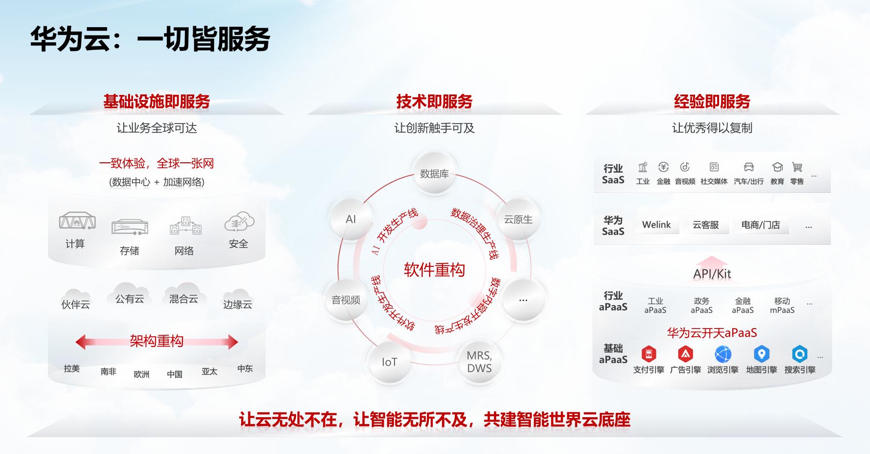 郭平也談到在“一切皆服務”的戰略下,華為會持續將每年百億美元以上研發投入的成果和30多年在ICT領域的積累開放出來,以雲服務的方式將領先技術提供給千行百業的客户、夥伴和開發者。