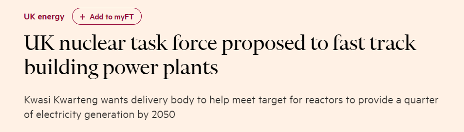 據英國《金融時報》(FT)22日消息,英國商務大臣科瓦滕(Kwasi Kwarteng)正在推動成立核電特別工作組,以此達成英國首相約翰遜提出的“到2050年核能至少提供1/4發電量”的目標。英國政府高層希望該工作組能以“曲速”(warp speed)交付新的核電站。