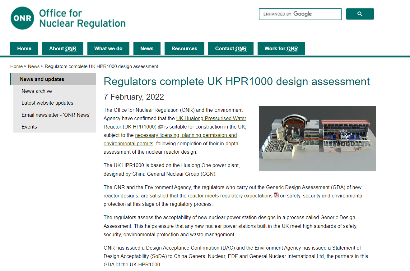 “經嚴格評估,華龍一號符合我們期待的高標準” ONR網站截圖