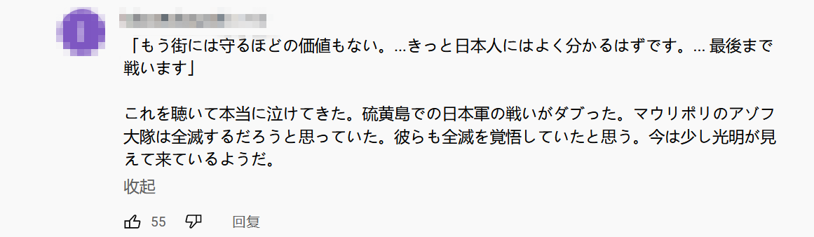 “最後這句話讓我很感動。日本廣島、長崎被空投原子彈,還有東京大空襲,很多城市都曾一度被燒成廢墟。儘管如此,多虧了那些誓死保衞國家的人們才有了今天,希望(烏克蘭)也為了後世而努力。”