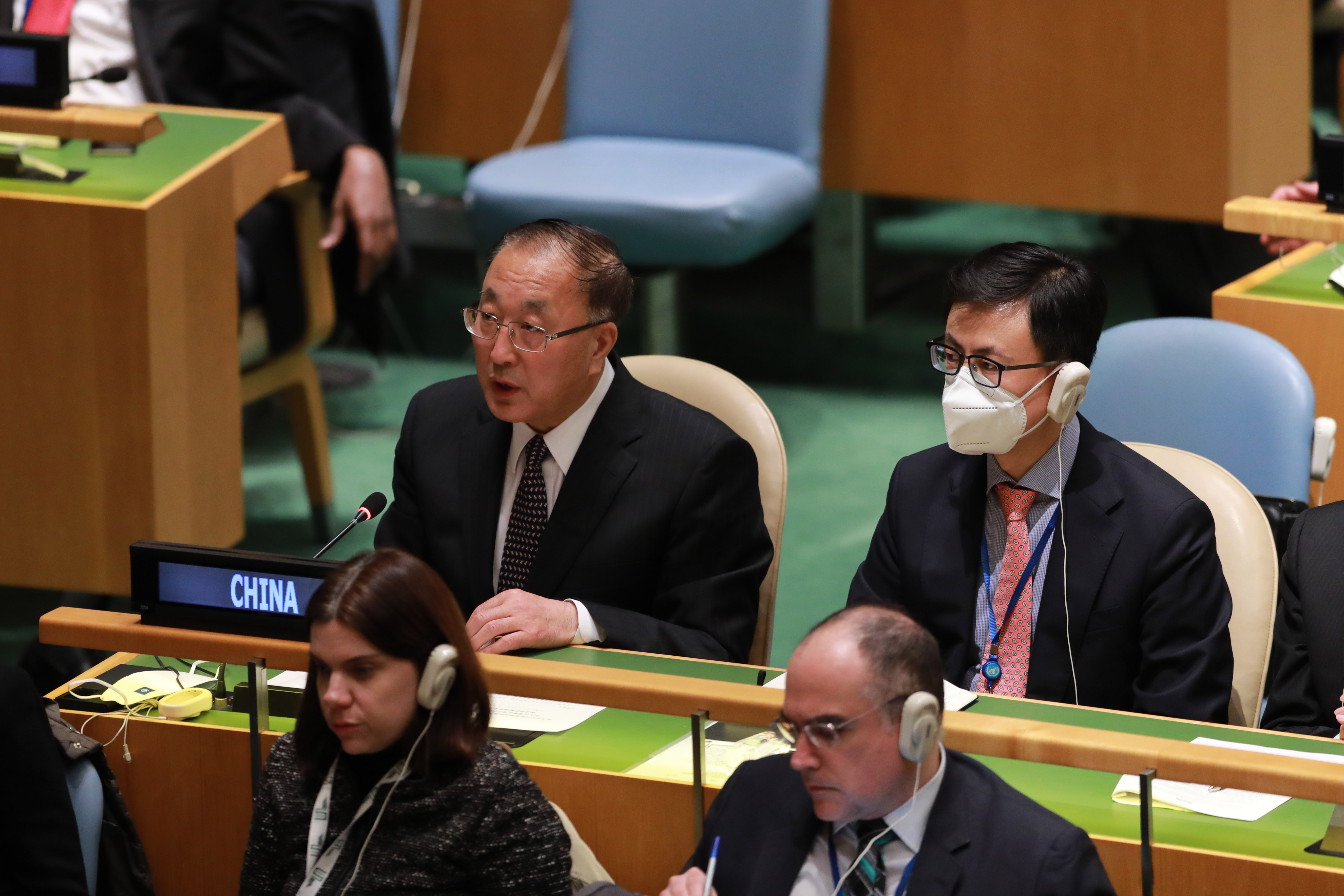 中國常駐聯合國代表張軍在表決前的解釋性發言中稱,在烏克蘭問題上,中方始終主張,包括烏克蘭在內的各國主權和領土完整都應得到尊重,《聯合國憲章》宗旨和原則都應得到遵守,各國合理安全關切都應得到重視,一切有利於和平解決危機的努力都應得到支持。推動早日停火止戰是國際社會的迫切期待,也是中方的努力方向。中方支持一切有利於緩解烏克蘭人道危機的倡議和舉措,呼籲當事方尊重國際人道法,採取切實行動保護平民安全,保障婦女、兒童等弱勢羣體的基本權利和人道需求。有關布恰鎮平民死亡的報道和畫面令人不安,事件的相關情況和具體原因必須查清。任何指控都應基於事實,結論得出之前,各方應保持克制,避免無端指責。