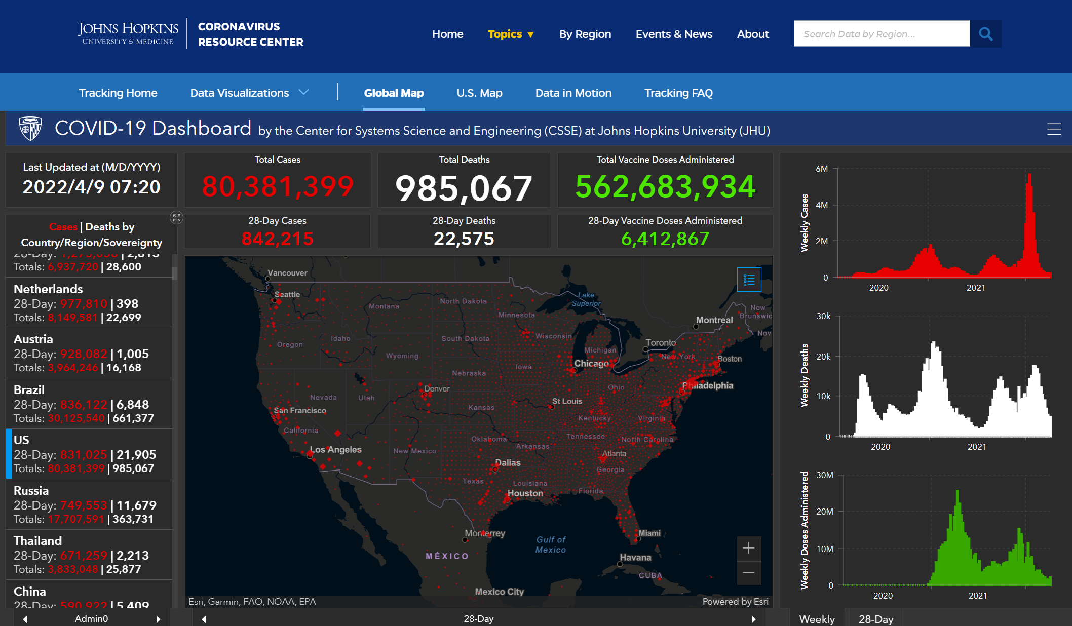 (觀察者網訊)根據美國約翰斯·霍普金斯大學統計數據,截至北京時間4月9日7時20分,美國新冠肺炎累計確診病例達到80381399例,累計死亡病例達到985067例。在過去約25小時裏,美國新增確診病例94781例,新增死亡病例565例。