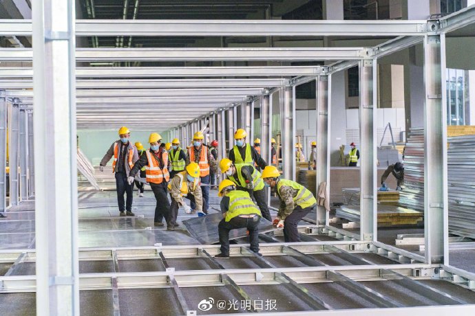 8日晚,記者在現場看到,中建三局承建的3號、4號館,中建八局承建的5號館、6號館都在進行緊張的收尾工作。建設者們與病毒賽跑,與疫情較量,歷經4天日夜鏖戰,以最快速度推進施工,服務上海疫情防控。上海醫療管理團隊提前介入,與工程人員磨合細節。