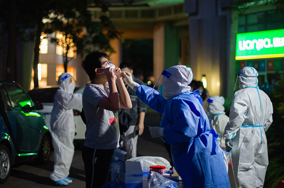 2022年4月9日,上海隨申辦“核酸碼”推廣使用首日,普陀區中遠兩灣城的居民有序做核酸。 樂浴峯 圖