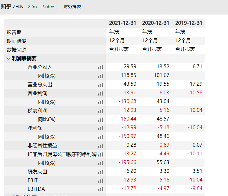 2019-2021財年,知乎淨利潤連續錄得虧損。知乎今年3月14日公佈的財報資料顯示,知乎2021財年營收為人民幣29.59億元,同比增長118.9%。不按美國通用會計準則(non-GAAP),知乎去年調整後的淨虧損為7.471億元,而2020年淨虧損為3.375億元,同比虧損擴大了121%。