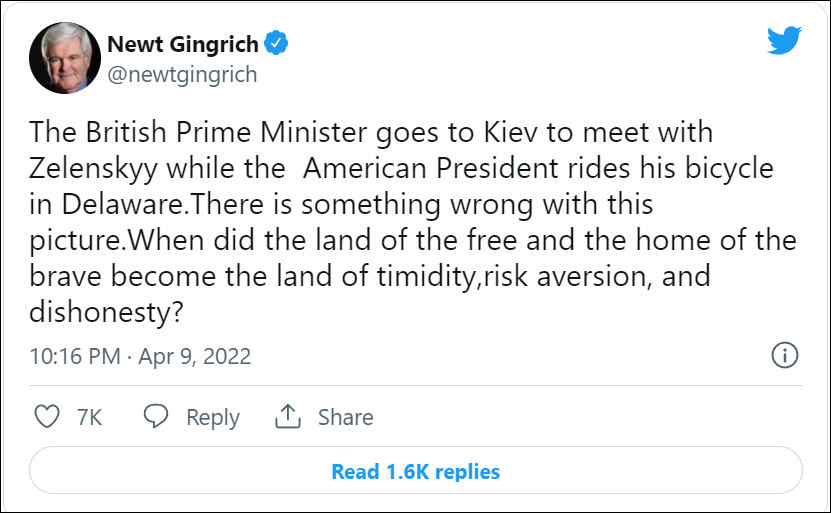 前美國國會眾議院議長,共和黨領袖人物紐特·金裏奇(Newt Gingrich)也在推特上批評道:“英國首相去基輔會見澤連斯基,美國總統卻在特拉華州騎自行車。這種場面有些不對勁。從什麼時候起,自由之國、勇敢之家變成了膽怯、逃避風險和不誠實之國?”