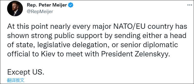 密歇根州共和黨眾議員彼得·邁耶(Peter Meijer)發文寫道:“在這個時候,幾乎每一個北約/歐盟的主要國家都派遣國家元首、代表團或高級外交官員到基輔與澤連斯基會面,以示強烈的公眾支持。除了美國。”