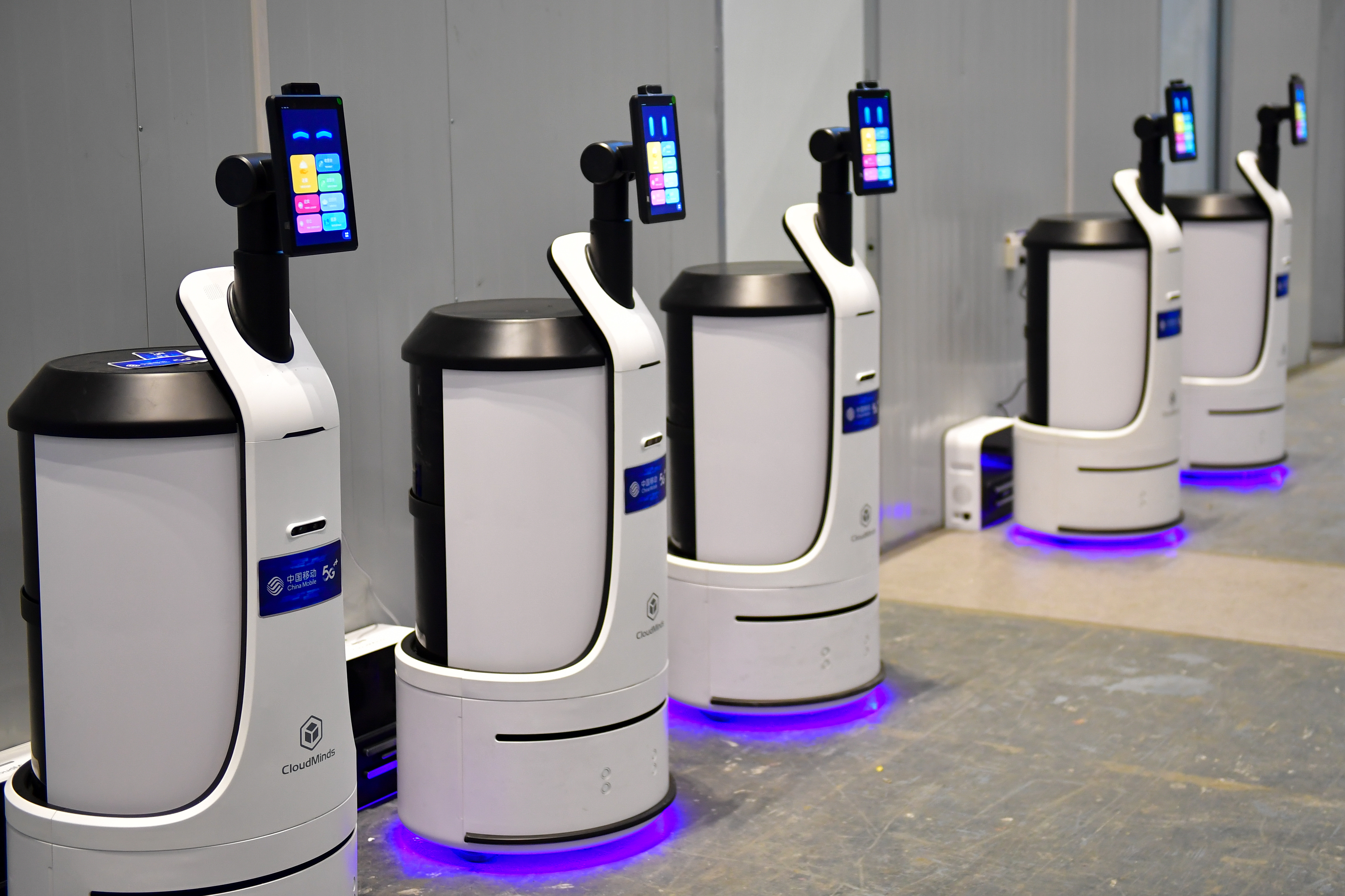4月8日晚,國家會展中心(上海)3號館的方艙醫院交付使用。圖為3號館內的送餐機器人。圖源:視覺中國